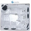 Massage SPA Features: 1) Dimensions: 2190*2360*940mm 2) Seating capacity:6 people 3) Water capacity: 1000L water 4) Gross weight: 460KGS 5) Shell: imported acrylic 6) Shell colors: marble white / blue / black 7) Nozzles: 5" seven hole Nozzles6 pcs 3.5" whirly massage Nozzles16 pcs 2" direction adjustable Nozzles26 pcs dense outlet Nozzles17 pcs T fragrant-adding equipment1 pc stainless steel air Nozzles12 pcs 9) Light: 1pc 30W LED high light, 7 color wall lamp, 2pcs 3W LED seven color fountain light 10) Spa heater: 4.5kW 11) Flotation:1 cartridge filter 12) Water pump: 1pc 300W circulation pump,3 pcs 2.5HP massage pump 13) Air pump: 120W 14) External material: cedar/sunpoof PVC/White Ash 15) Sterilize: ozone one set. Water disposal system: Active Carbon, Argentums Hydronium 16) Voltage: 230V / 110V 17) Phase: 1/3 18) Heat preservation: isolation foam around and bottom 19) Cover: leatheroid with isolation foam 20) CD/DVD and TV system: with or without 21) Bubble device 22) Add speaker under water 23) Stainless steal bracket 24) ORP/PH digital contoller: 1 setMain Characteristics of Hot Tubs 1. Jet system Jets systems with different functions are installed in every ergonomic hot tub. With powerful massage pumps, these jets system can bring you the best experience of massage and efficiently reduce any accumulated fatigue in your muscle. 1) Back-scanning Jet system 2) Seven-hole jet system 3) Rotational jet system 4) Intensive-directional jet system 5) Precise jet system 6) Dense small jet system 7) Bubble jet system 8) Essential oil 9) You can choose two different jets 2. Exceptional lighting system We use high-intensity LED lights in our hot tubs. These LED lights are brighter than normal lights but more energy efficient. You could pick up one color to suit your mood or cycle through all colors, it is just your choice! The hot tubs are equipped with 30w main light, sparkling water-level light, colorful fountain and waterfall light as well. Combining with our outstanding music and video system, these colorful lights will give your exceptional experience. 3. TV and music system. According to your requirement, our hot tubs can be equipped with 15 17 inch TV with waterproof remote control to realize TV and DVD function, and also can be equipped with audio system to work with the TV or let you listen to your favorite radio channel. Both TV an speakers can be automatically lifted up or folded in by pressing one button. You will find that your hot tub is your favorite place after working. 4. Heater and filtration system They are the heart of the whole hot tub system which must work for a long time and can resist high temperature and corrosion of water and chemicals. Therefore the quality of these two systems are crucial for hot tubs to operate safely and reliably, and important for efficient filtering and energy efficiency as well. Heater is the most vulnerable part of the hot tub systems. We construct the heating elements with special stainless steel and coated with Teflon so that they are resistive to corrosion and ion agglomeration. With the exclusive intelligent heating-by-section function (balance the work load), the heater is high efficiency, energy saving and durable. The filtration system is a combination of nonwoven fiber filter, silver ion activated carbon, medical stone and ozone system (generator, atomizer and mixer), to give you totally pure, clean water for your spa. 5. Advanced and reliable control system With ten year nonstop research and development, Keya brings you an easy and reliable operating, high quality control system. The control system consists of two parts: the control panel and circuit box. User can switch between different operating mode through the control panel, such as; commerce mode (COMMERCE), family mode (FAMILY), sleep mode (SLEEP), and pause mode (PAUSE). The control panel also offers a visible way to examine the status of the hot tub. By pressing the corresponding buttons, user can set the temperature (in both and ) and time (including the starting and stop time of the heat preserving function in FAMILY mode); start massage pumps and air pump; turn on and off the light or cycle through colors. The hot tub system will operate differently according to different setting. Specifically when the heating preserving function of Family mode is off or under SLEEP mode, the hot tub will run with low temperature to save energy. The force electricity and weak electricity are separated inside the circuit box and electronic sensors are used instead of conventional mechanical water flow sensor and water level sensor. Therefore, all these designs guarantee a stable and reliable system. The control systems adopted by the hot tubs have self-diagnose function and double-protection. All diagnose information will be displayed on the LCD panel to remind the user for safety or trouble-shooting. The independent over-heat protection system will cut off power when unsafe temperature has been detected. For cold countries, an independent anti-freeze protection system can be installed which can activate the heater to avoid any damage caused by frozen. 6. Spa shell We use high-quality LUCITE acryl as the hot tub shell to provide great resistance to temperature, abrasion and UV. With the benefit of great stretch ability of the LUCITE acryl, we are honored to present you the aesthetic, streamlining and comfortable Spa shell which is exclusive to our company. 7. Spa cabinet We offer customer with two kinds of material for your Spa cabinet: a) Natural wood: you can choose from various natural woods which give you the natural warmth and represent your nobleness. b) Rigid polymers cabinet is durable and easy for maintenance. 8. Cover We choose the high quality leatherette which is qualified for the ASTM Ultra-Violet 2000 exposure test for your hot tubs cover. The 4 inches filling foam inside whose density is 25KG/CBM, is reinforced by metal frame and sealed by plastics. All these factors make th